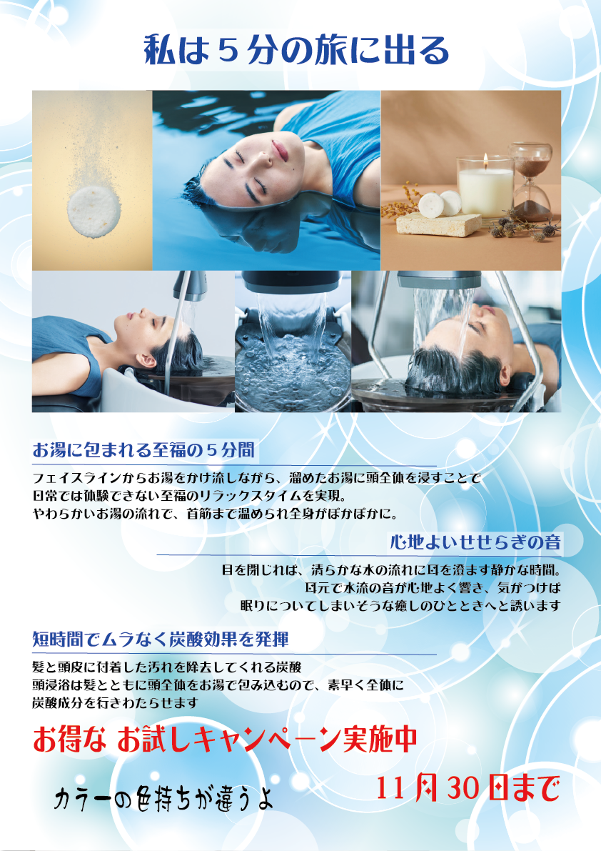 頭浸浴は髪とともに頭全体をお湯で包み込むので、素早く全体に炭酸成分を行きわたらせます
